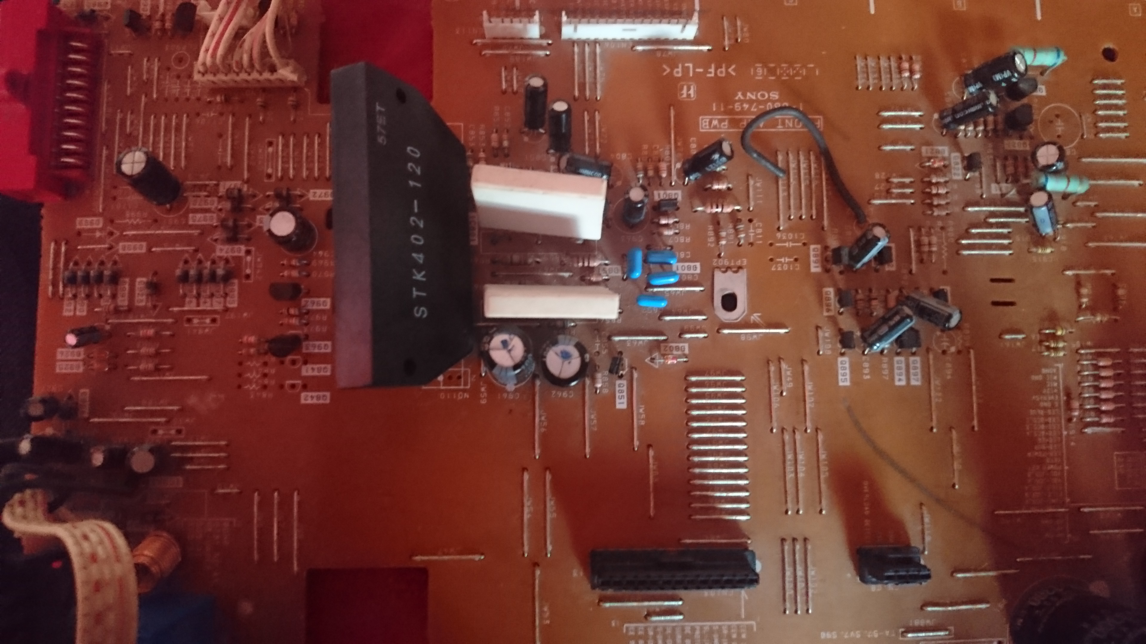 Detin aceasta linie audio cu urmatoarea problema la amplificator,cand o aprind intra in protecție. IC-ul de la amplificatorul stereo(stk402-120) pe care l-am schimbat si avea un canal in scurt.. La fel mi la ars si pe cel nou..precizez ca daca scot pinul de la ic de la alimentarea canalului in cauza functioneaza perfect..bineînțeles doar pe un canal..am masurat tranzistorii si diodele..toate sunt ok...un sfat va rog..