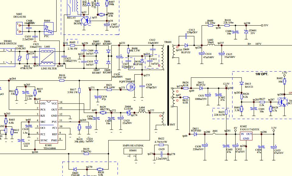 multumesc de schema,difera unpic,sasiu meu nu are releu in sursa...problema este ca nu porneste sursa deloc.siguranta este buna,didele din punte sunt bune ,rezistentele....daca ati mai intilnit acest gen de defect puteti sami spuneti ...dupa constatarea mea este busit tda16846p....dar mai astept o ideie dela profesionisti....multumesc de ajutor
