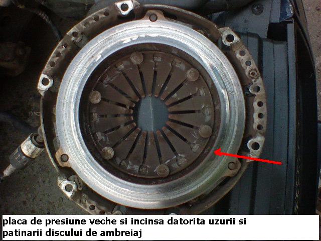 La demontarea ambreiajului am constatat ca se mersese ceva cu el peste limita de km admisa si din acest motiv discul de ambreiaj a ajuns la nituri si a permis acestora sa frece suprafata de contact a volantei,facand canale pe ea si invinetind-o de temperatura.