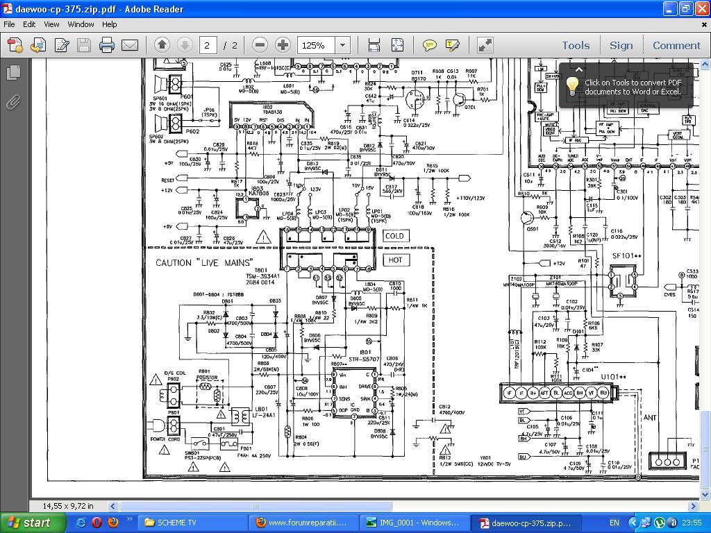 Avand in vedere ca STR-ul a fost defect in comanda si nu a fost ars tranzistorul de forta, inclin sa cred ca tv-ul a fost traznit. Verificati daca aveti 5V pe procesor si pe memorie. Daca nu aveti anulati pe rand pinii de alimentare pana apare aceasta tensiune. Posibil procesor in scurt. Posibil defect si I802.