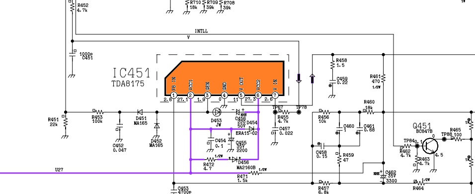 Am primit acest tv la reparat cu defectul linie orizontala ,exista sonor. Am gasit finalul bv. TDA8175 crapat ,R472 arsa, D456 scurt.Dupa inlocuirea acestor componente cu unele noi , am inlocuit preventiv C456,C455,C462,D454.Acum televizorul functioneaza corect dar dupa aproape 30 minute imaginea se strange in partea de jos a ecranului cu 2 cm si ramane asa tot timpul.AM verificat tensiunile pe pini TDA8175 si sunt in parametri normali. Va rog sa ma ajutati , daca s-a mai intalnit cineva cu acest defect , unde as mai putea verifica .Sasiul este EURO-2.