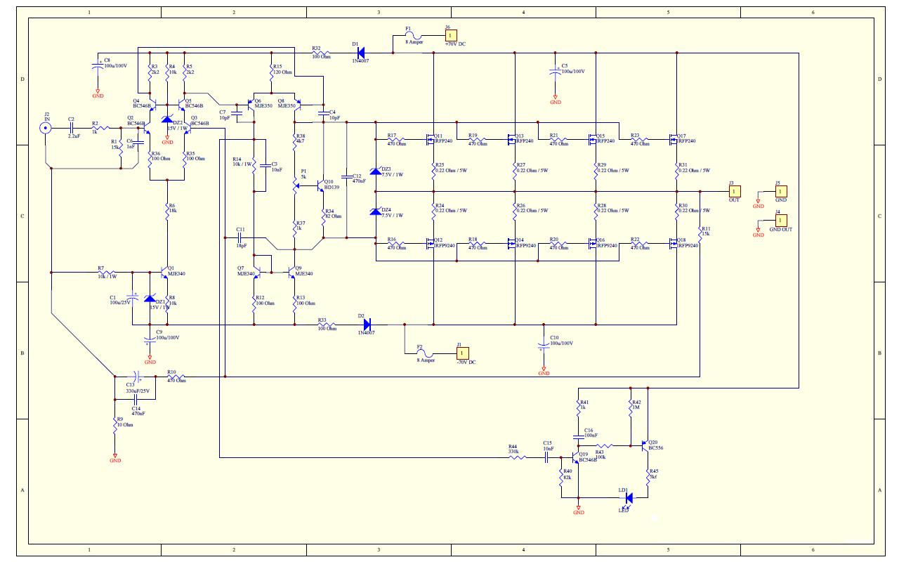 Pentru o buna functionare a amplificatorului este necesar sa reglam curentul de mers in gol,lucru care se realizeaza din P1.Cel mai simplu este asa:p1 trebuie sa fie dat la minim,intrarea sa fie in scurt si iesirea in “aer”, dupa care se pune voltmetru pe una din rezistentele de 0.22ohmi,rotind din trimer pana cand va indica o tensiune mica 5…10 mv.Se masoara tensiunea pe toate rezistentele de 0,22ohmi si ne oprim pe cea care arata cea mai mare tensiune,pe care o vom folosi in continuare ca “etalon” pentru restul.Tensiunea pe aceea rezistenta trebuie sa fie in jur de 14-17 mv,dupa care se lasa sub functiune vro juma`de ora dupa care se fac ajustarile necesare,recomandabil a fi sa NU se lase nesupraveghet montajul pentru a nu se ambala termic!Mai jos aveti schema si documentatia tehnica pusa la dispozitie de Anthony E Holton.Spor la treaba!
