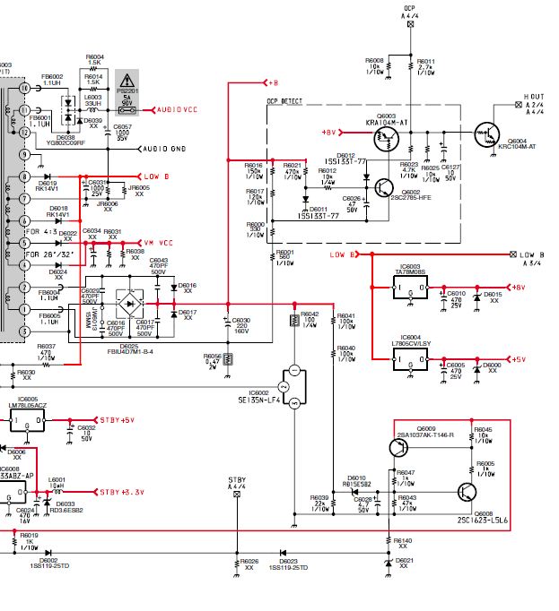 Daca scot bobina L5002 , tensiunea pe bara de +135v este normala , si se mentine cat si celelalte tensiuni , de 10v , 8v, 5v . Pe drena tz driver al finalului linii ajung 77v .