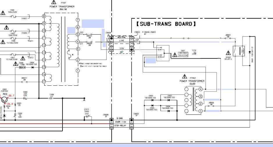 Verifica siduranta intre pinii 2 si 3 la transformatorul PT901....verifica continuitatea infasurarilor intre pinii 3, 4, 5 la acelasi transformator. Releul RY901 conecteaza cand alimentezi? (ajung 220v intre pinii 2 si 5 ai traf-ului?)