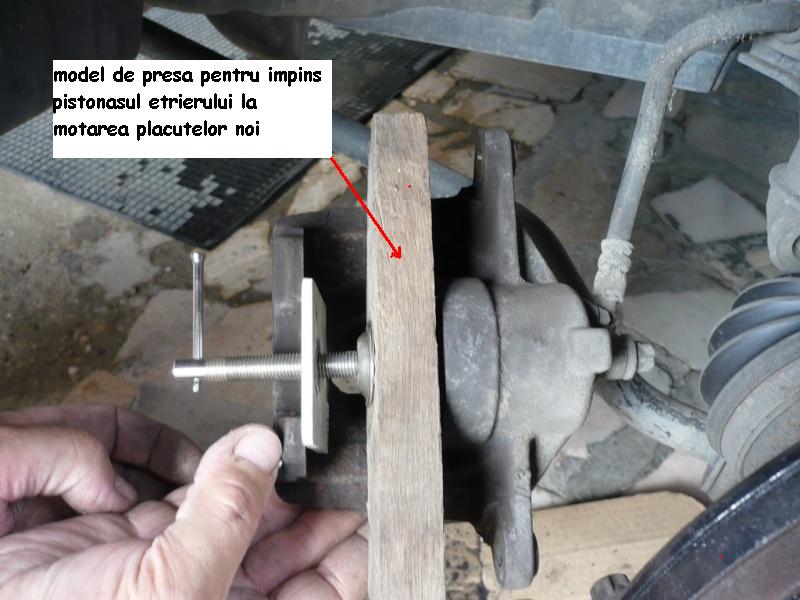 Remontam discul,suportul etrierului,placutele de frana si ajungem la etrier,dar pistonul acestuia trebuie presat mai in interior deoarece placutele noi sunt mai late si etrierul nu se poate monta.Cum putem face cea mai simpla presa, de comprimat acest piston?