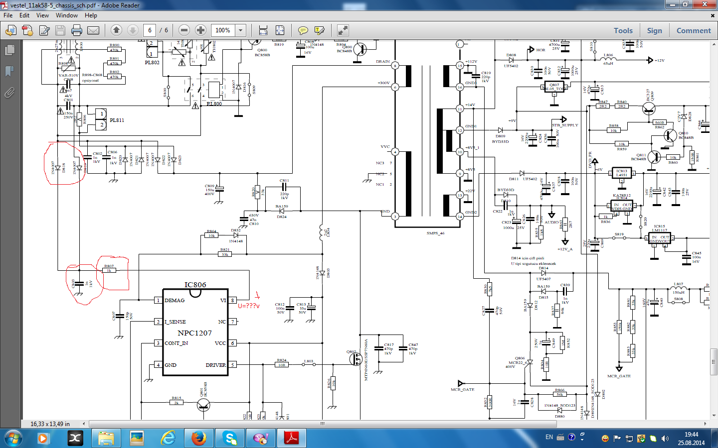 la acest sasiu nu reusesc sa porneasca sursa.nu am 380v pe pin 8 integrat sursa.am numai 184v.am schimbatc-urile di sursa d831,d812 r802 si nu reusesc sa fac acei 380v.ma scoate cineva din impasul asta?pe c807 am 320v.multumesc.
