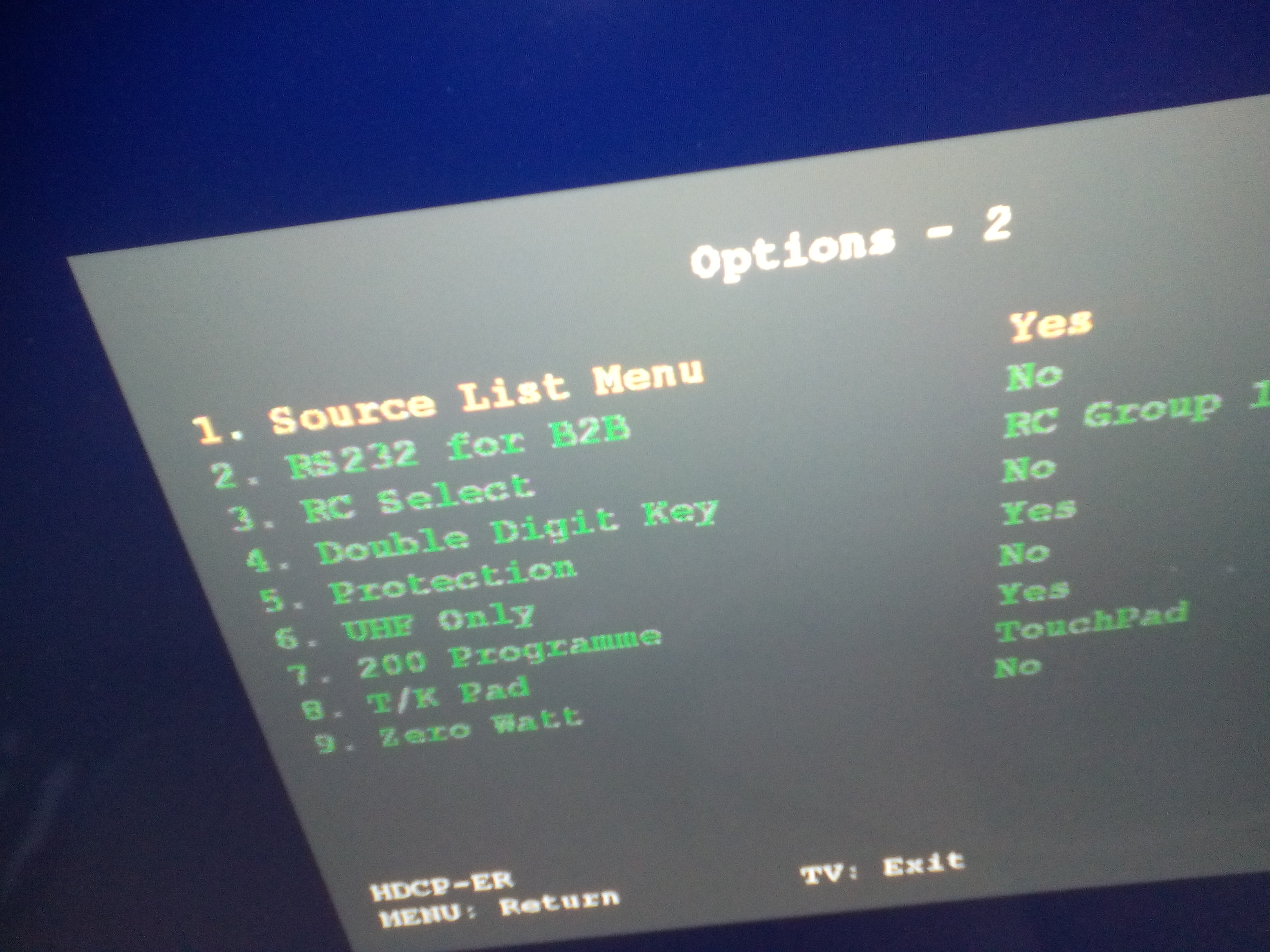 Ati intrat in meniul de service (cum v-am spus)? Aveti la rubrica <options> , <select panel>? Puteti accesa meniul de instalare? (ma refer daca nu cumva este in "hotel mode" , in acest caz secventa de service este <menu~1~4~6~1>)