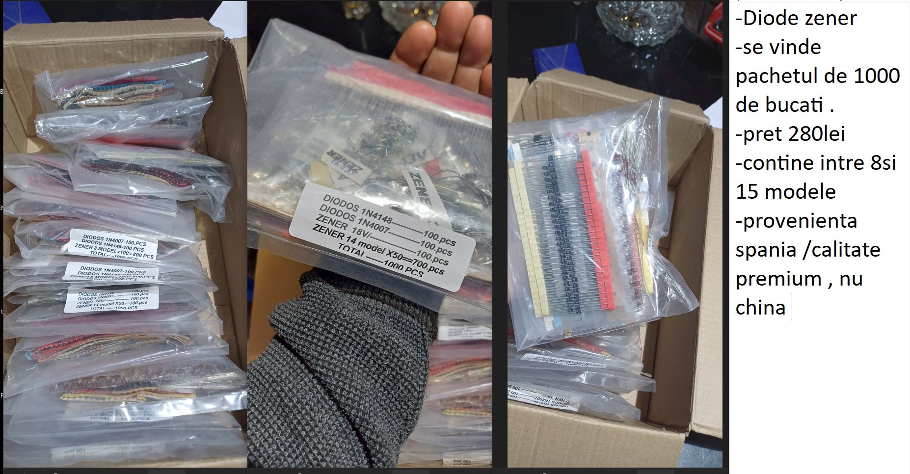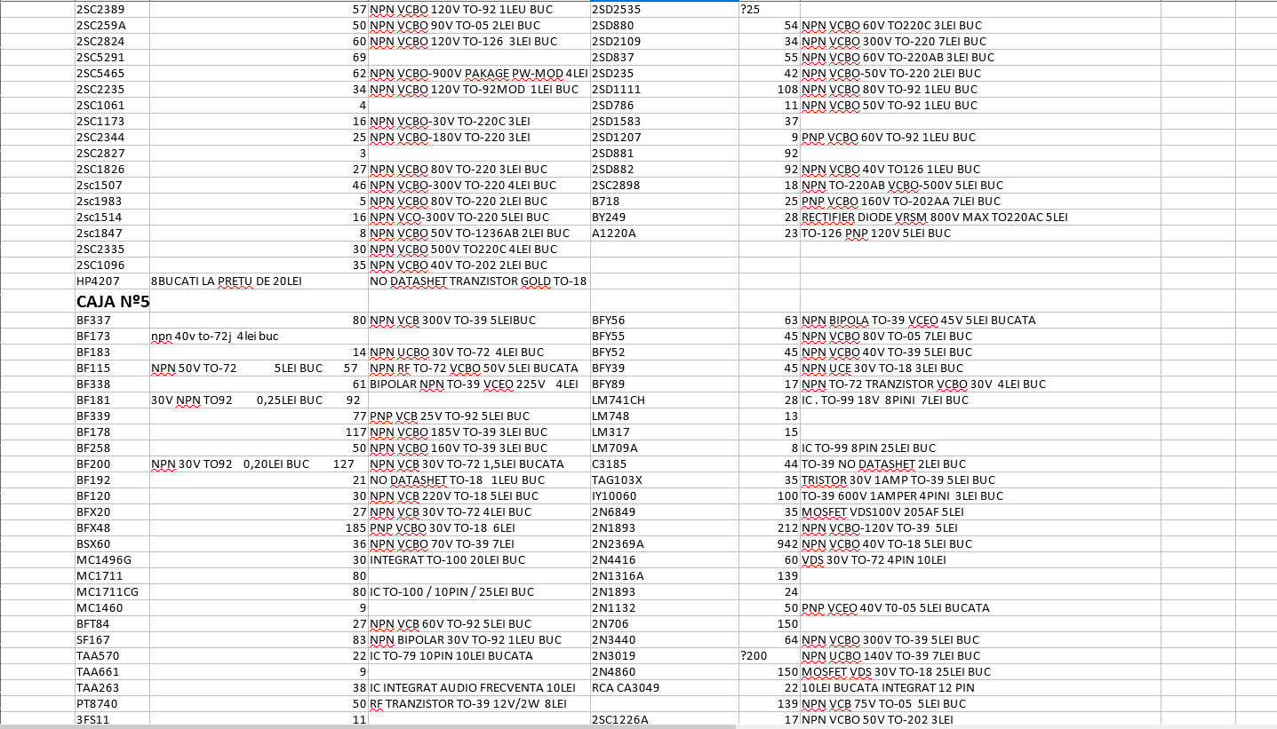 mai am la vanzare , tranzistori , diode zeiner, varisotr , rezistorii dale ,bobinati,metalici , trafo din recuperari audio / pot trimite poze lista cu pret si detali in email sa-u wattzap ,cata090@yahoo.com tel 0762539093