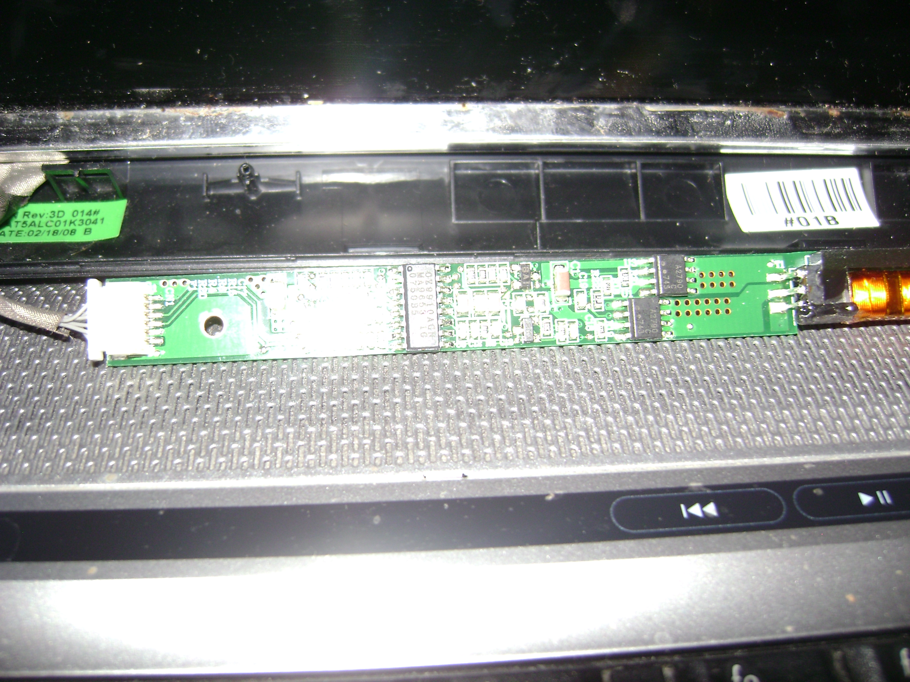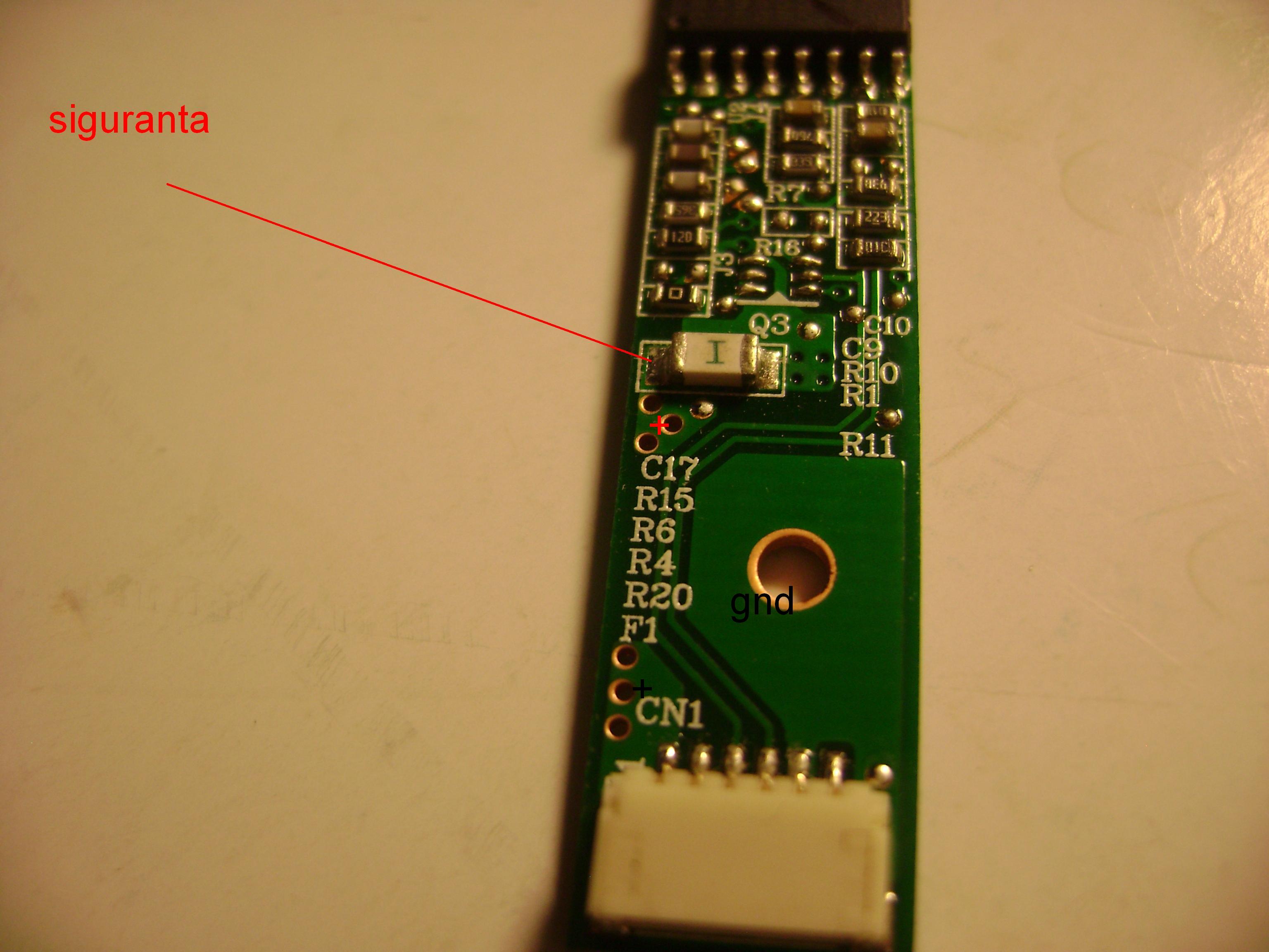 Invertorul are rolul de a alimenta un tub de neon aflat in spatele cristalelor lichide ale monitorului.Tensiunea necesara alimentari tubului de neon este in jur de 400-600v,tensiune care o produce invertorul.De obicei invertorul este in partea de jos a monitorului,vezi foto 1.De pe placa de baza vin o serie de tensiuni care difera de la model la model,(3.3v,5v,12v)aceste tensiuni variaza in functie de luminozitate.Cel mai comun este arderea sigurantei de la intrere.Masurati tensiunile de intrare si masurati siguranta notata de obicei cu 1 sau f,daca este arsa se strapeaza si se probeaza laptopul.Daca tot nu vrea sa mearga verificati si tranzistori smd plantati pe invertor.In lipsa tensiuni pe mufa de intrare este posibil ca si pe placa de baza sa existe o siguranta sau cablu intre placa de baza si monitor sa fie intrerupt.Atentie invertorul produce tensini mari la iesire,decuplati incarcatorul si acumulatorul inainte de a interveni asupra lui.