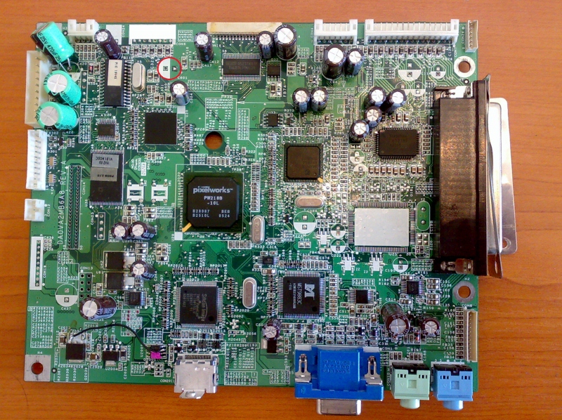 Salutare, am un tv lcd ACER AT2601W la care initial nu mergea tastatura (era blocata),am schimbat cond.electrolitici de pe placa de baza (vezi imaginea) si s-a deblocat (defect tipic ptr LCD_uri tip ACER) numai ca la unul din condensatori se pare ca sa defectat trecerea metalizata din cablaj (acum tastatura merge ,dar imaginea este desincronizata). Am scos cond. si l-am marcat cu cerc rosu (vezi img.). Daca cineva ma poate ajuta cu o schema va rog ! Nu reusesc sa dau de traseul care duce la cond. prin placa. Multumesc anticipat !